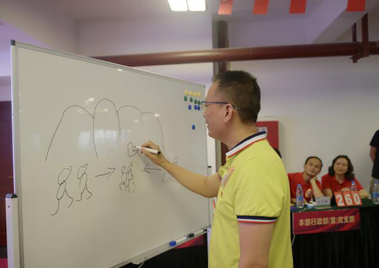 來自本部行政部(室)、物業管理中心、文創公司、宏鑫公司的4支代表隊摩拳擦掌,同臺競技,以飽滿的精神面貌迎接團體賽答題挑戰。團體賽分為“撥亂反正”(判斷題)、“紅軍長征”(必答題)、“百團大戰”(搶答題)、“飛奪瀘定橋”(風險題)、“智取威虎山”(趣味題)5個環節,精彩紛呈,環環相扣。